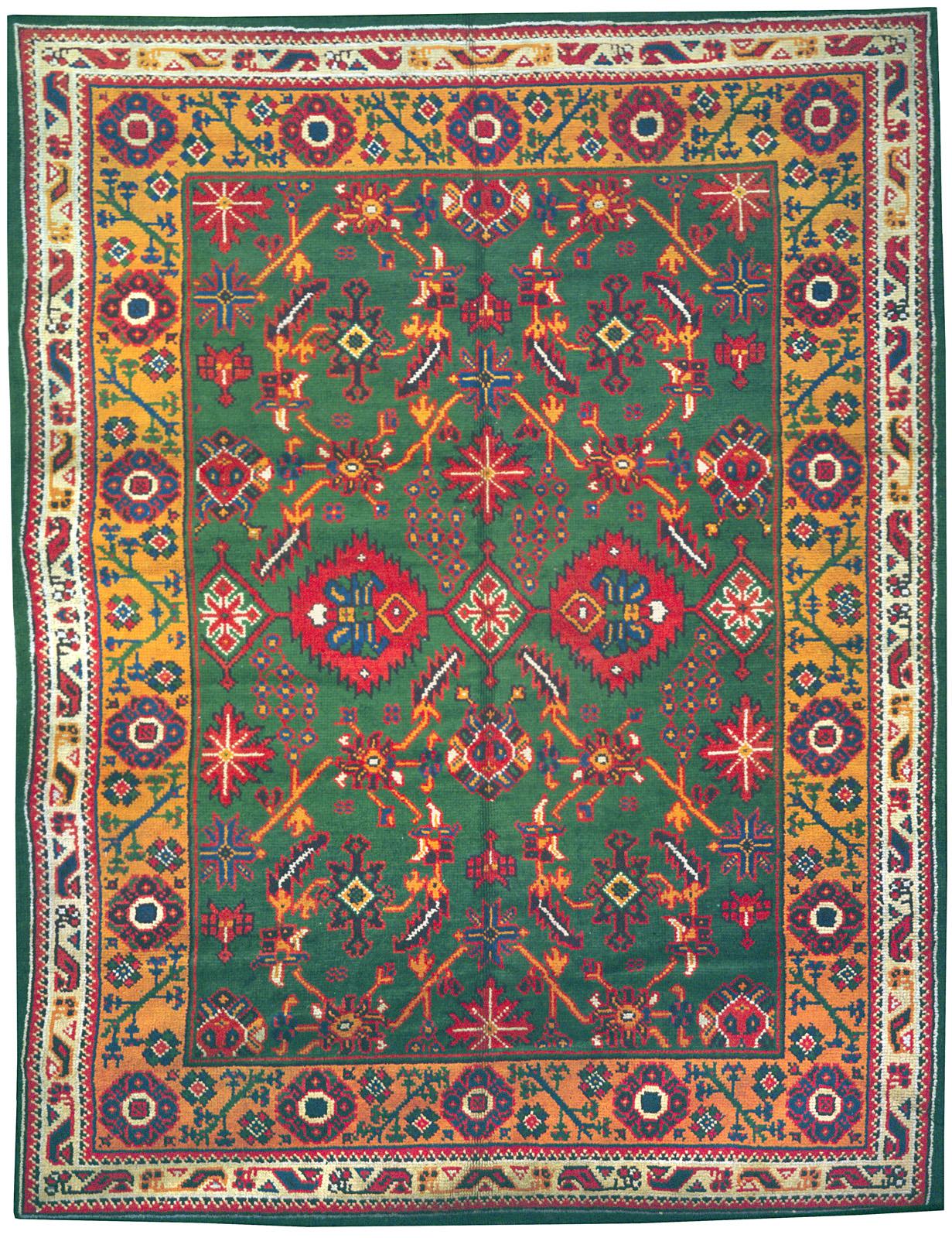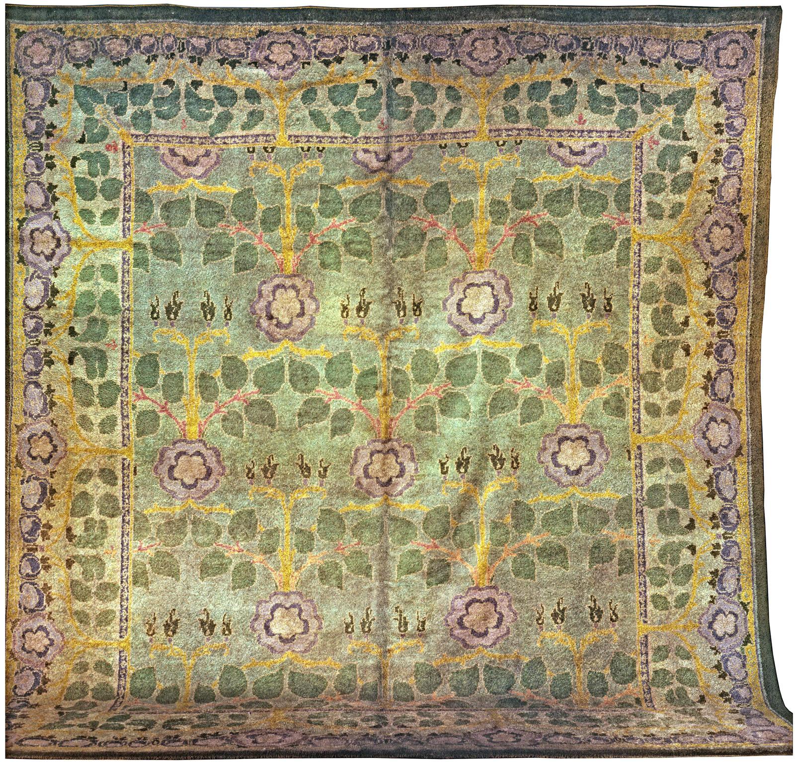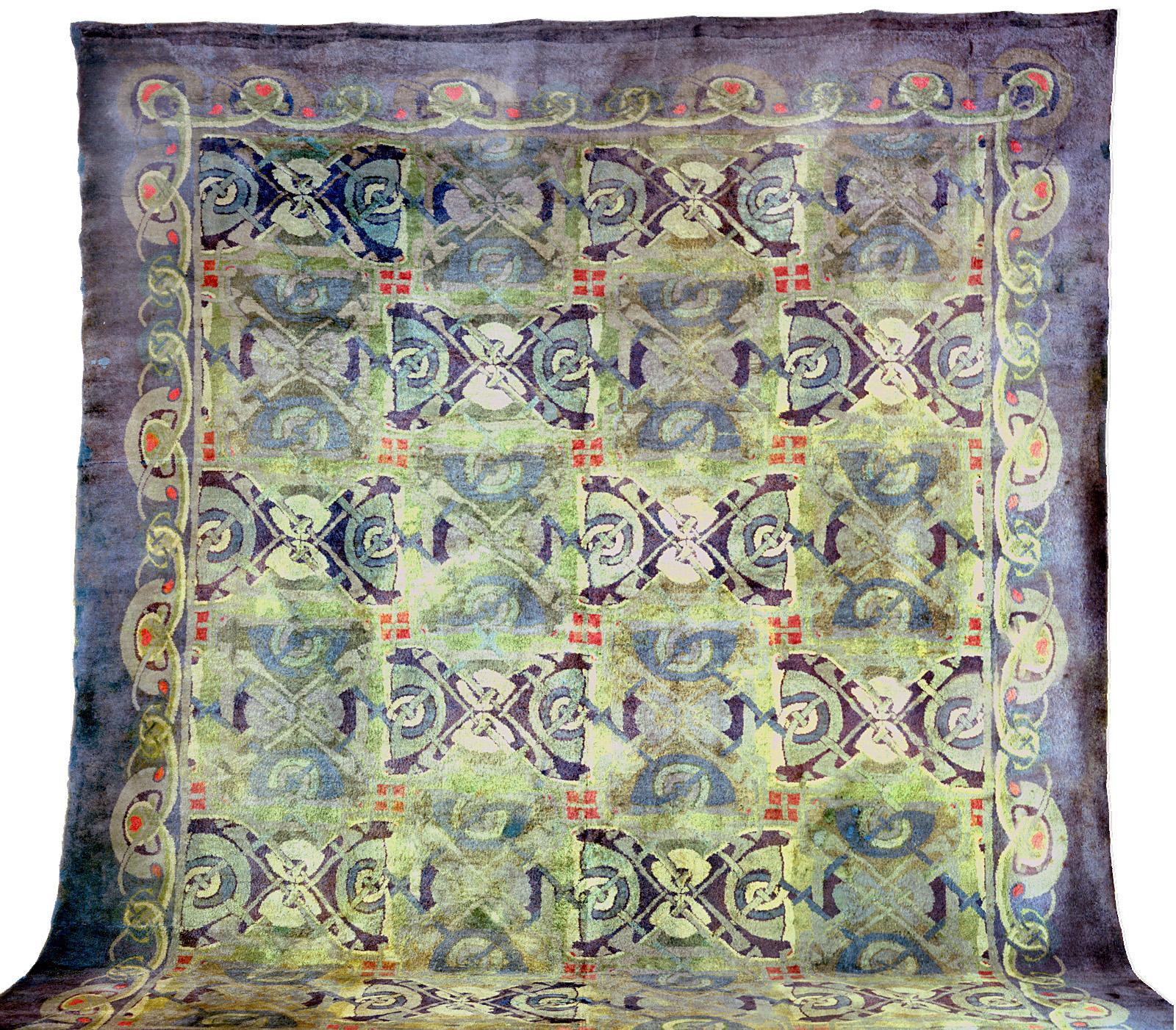 A carpet manufactory was established at Killybegs, County Donegal in Ireland. It was intended to provide local employment and find use for the locally produced wool. The carpets were created to be robust and, at first glance, appear to resemble contemporary Oushak carpets. Design varied but the most interesting were original Art and Crafts models designed by Charles F A Voysey (1857 – 1941) and Archibald Knox (1864 – 1933), among others. These were exhibited and marketed by the leading decorating store, Liberty’s, with other Arts and Crafts furniture and textiles. The workshops specialized in bold and innovative colours and colour combinations such as silvers and aubergines, rarely encountered on other carpets. Unfortunately the output declined after WWI.