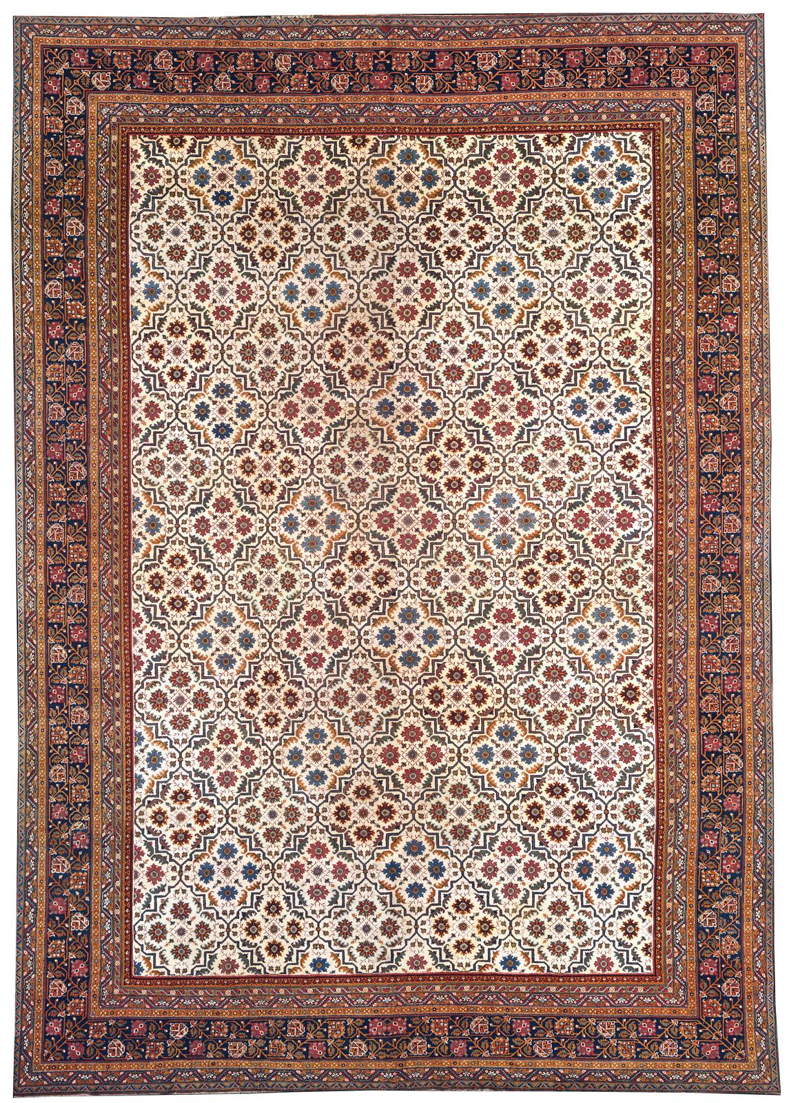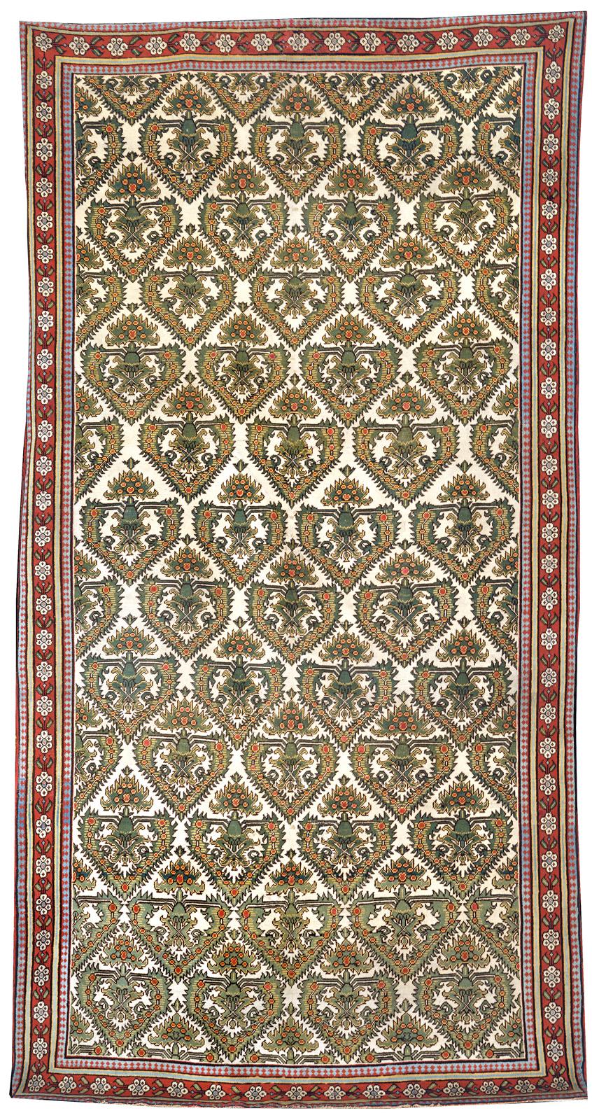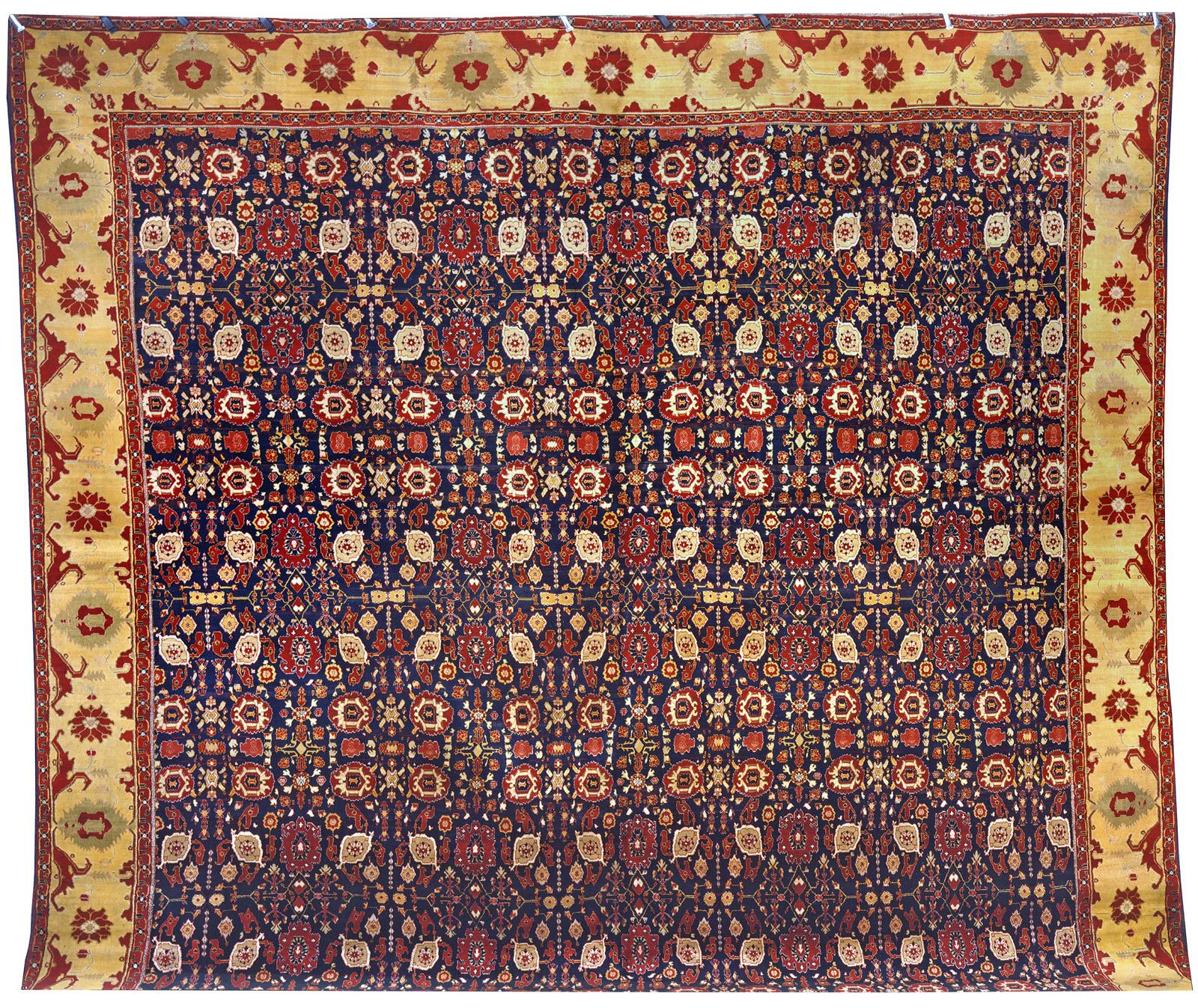 Carpets were first produced in Mughal India in the 1520s and Court workshops were set up in the Imperial cities of Agra and Lahore. At first carpets were produced in the Safavid model with classical designs of floral, hunting and garden designs with cartouches, palmettes, arabesques and animals in combat. The Mughal versions display a uniquely Indian palette with an unusual purplish red and distinctive color combinations of hot pink and reds. The greatest Indian carpets were woven using the softest pashmina wool. Under British rule from the 1850s the art of the Indian carpet was revived and prisoners in the jails of Lahore and Agra were trained as weavers. Many exceptional carpets from Agra and Amritsar were exported via the powerful Anglo-Indian trading companies to the great houses of Europe. The unique coloration, subtle patterning and flamboyant scale of the Indian carpet ensures that it remains a byword for luxury today.