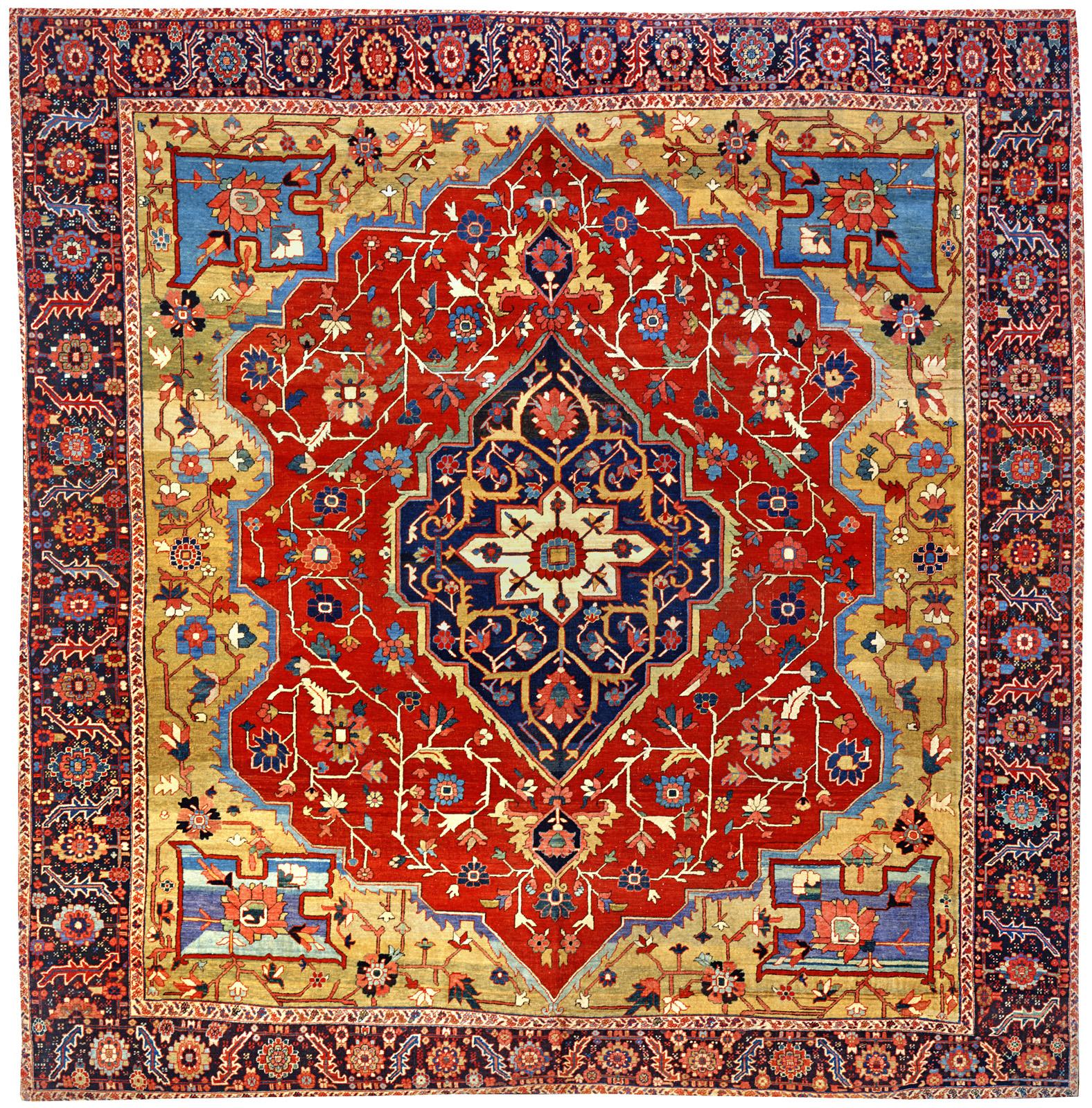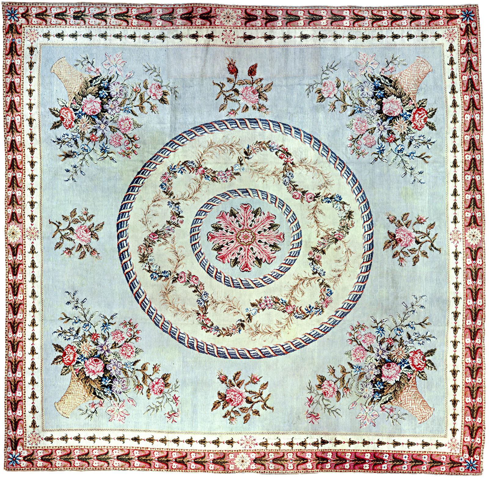 For many of us, an antique carpet evokes an image of an old fashioned rectangular Oriental piece with a central medallion, flanked by four spandrels, or corner motifs, within a distinct border, probably embellished with a rather hectic floral decoration. This stereotype is far from the real story and carpets with centralized designs can be the most elegant or harmonious, the most experimental or unusual of all. Central devices can range in scale from the smallest flowerhead on a geometric Persian Heriz to the grandest bouquet filled cartouche on a French Savonnerie. They are found in both Eastern and Western carpet production from all time periods. This is not your grandmother’s rug!