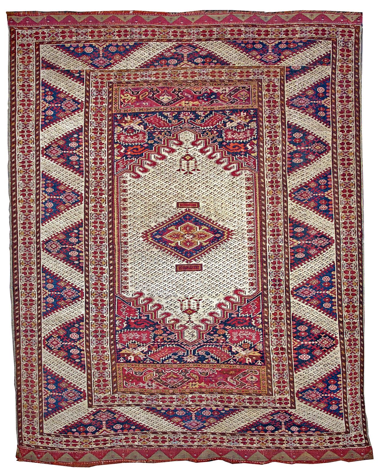 In tandem with the sophisticated town production of Ottoman Court carpets a lively tradition of carpet weaving developed in the villages and hamlets of the Ottoman Empire. In Bergama, Melas, Konya, Yuruk and Kula traditional designs were woven in a naive manner with a style similar to that of the Caucasian villages although with softer, mellower coloring.