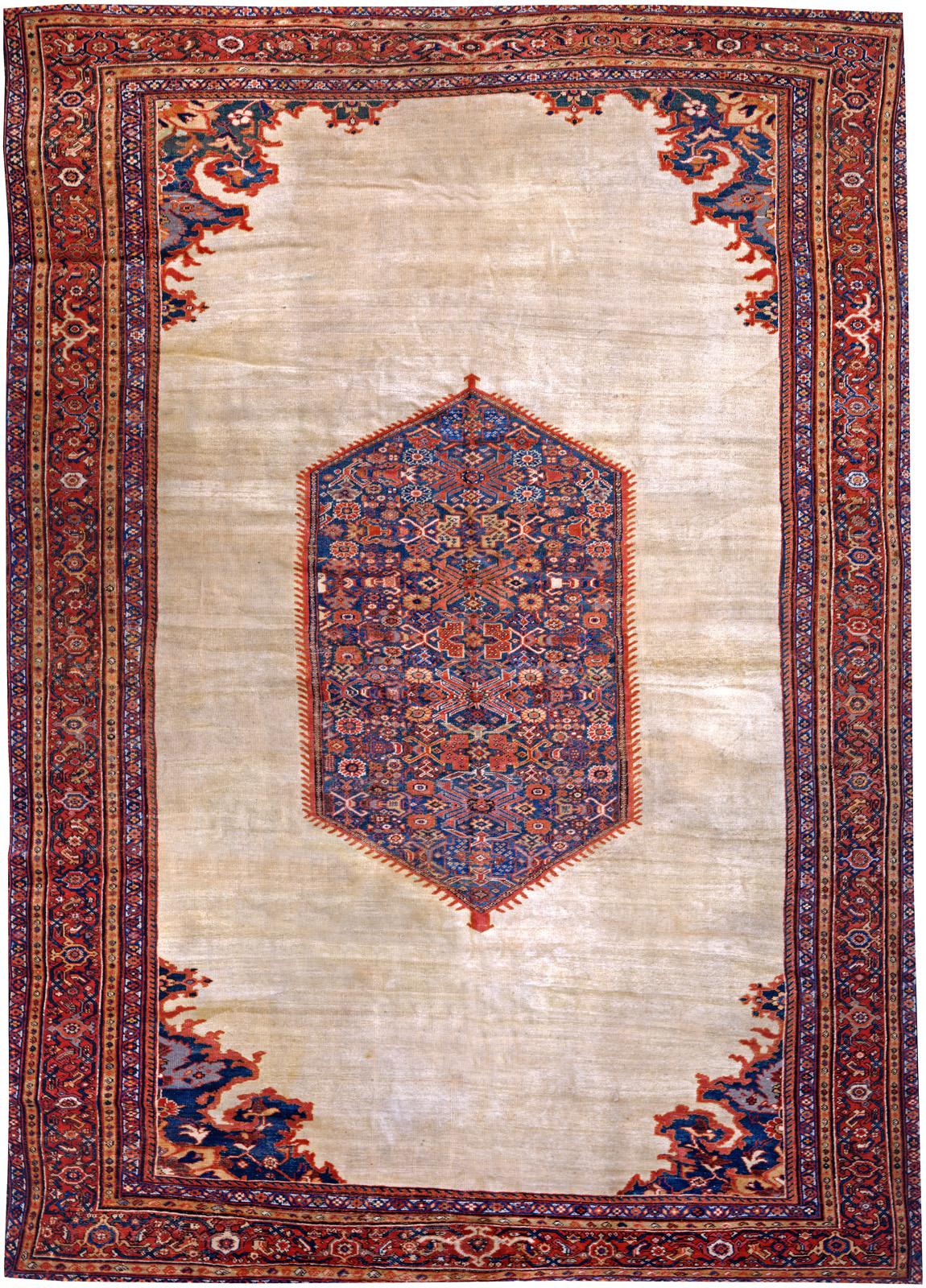 Despite their origins within sophisticated urban workshops many Persian carpets display a strong tribal quality. Heriz and Bakshaish carpets are amongst the most recognizable within the Persian repertoire. The familiar configuration of a central medallion, spandrels and borders is rendered here in an inimitably geometric fashion with an engaging simplicity of line. Some examples display all over designs with abstract interpretations of willow trees or ascending palmettes. The rugs of Fereghan are prized for their sturdy construction, angular drawing of floral decoration, quiet all over patterning and use of a splendid apple green dye. The Bakhtiari, a colorful nomadic tribe from the South produce dramatic designs distinguished by the liberal use of blue-black or charcoal both as an outline to individual design elements or as a field color. The extremely densely woven Bidjar, the ‘Iron Rug’ of Iran, from Kurdistan in the north, is known for durability and resilience, a mainstay of traditional country interiors, they are the ultimate in library carpets. In 1883, Ziegler & Co. of Manchester, England, established a workshop in Sultanabad, Iran to weave carpets from designs supplied by department stores including B. Altman and Liberty of London. The Ziegler Mahal carpets adapted traditional Persian designs to combine bold, allover patterns and softer palettes that appealed to a more restrained Western taste. Throughout Iran, geometric designs were produced by nomadic and village based weavers from the Belouch in the east, the Kurds in the west and the Qashqa’i in the south