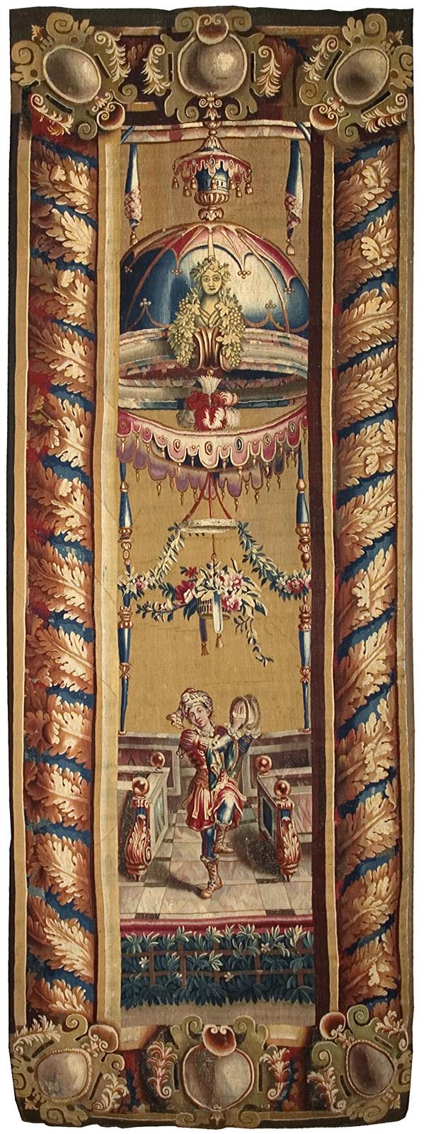By the turn of the 18th century the French court led fashionable taste and, apart from tapestries for public places, there was a move away from the former imposing and over-scale designs. Ornamental tapestries such as grotesques and armorials grew in popularity. In general there was a preference for smaller scale figures and more intimate designs. The range of designs widened to include chinoiserie, and designs of country life after David Teniers II (1610-1690), games, and sports as well as reinterpreting classical and mythological stories, and of course recording contemporary history. Landscape design also evolved, strongly influenced by the realism of Jean-Baptiste Oudry (1686-1755), as well as an appetite for the exotic with depictions of scenes from the East.