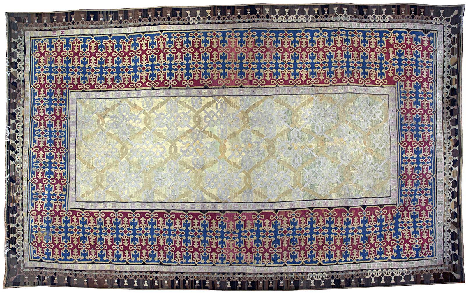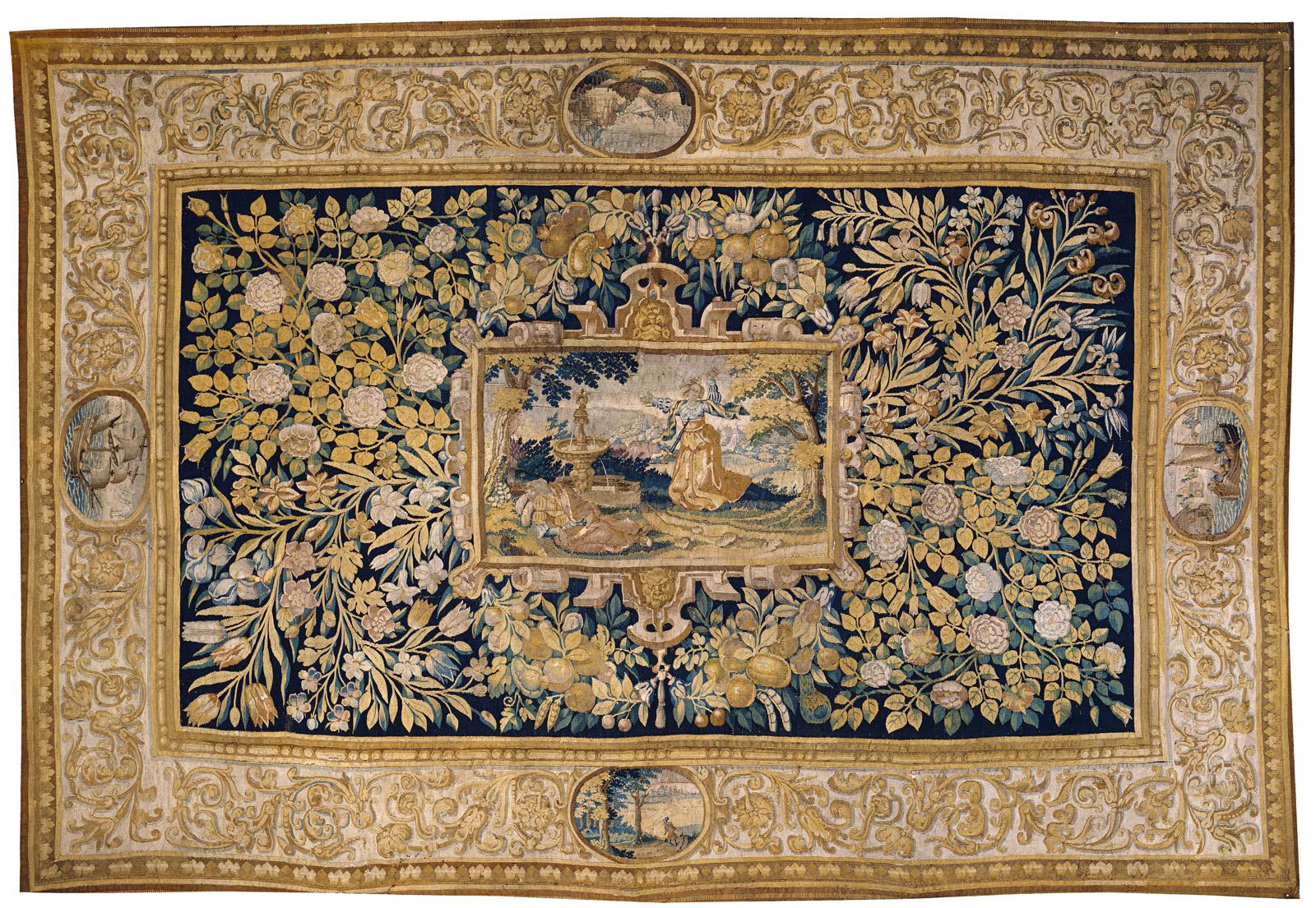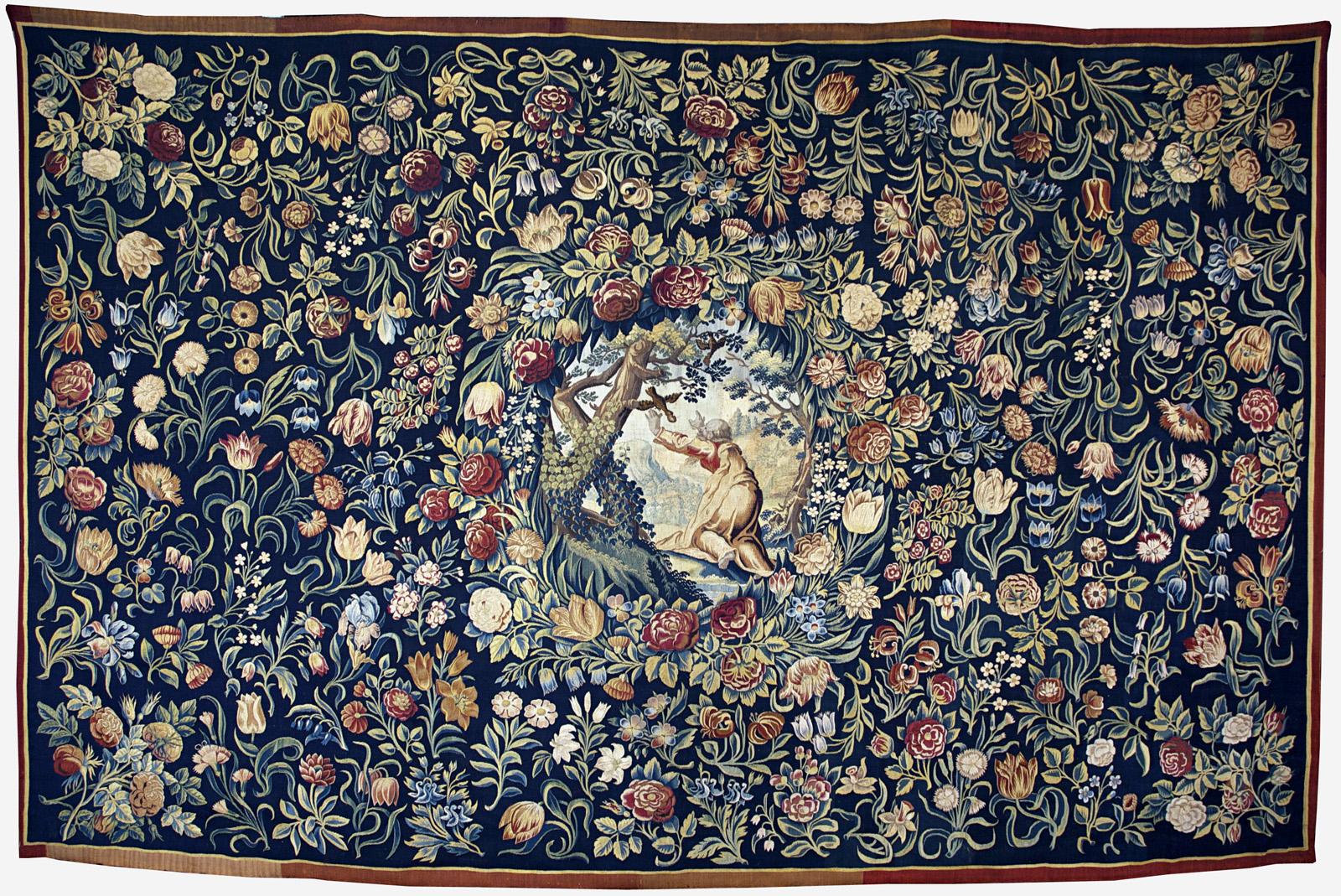Tables in the past, as now, were essential for dining, meeting, and for display.  During dining, easily washable linen and linen damask tablecloths were used.  But between meals, and for meetings, opulent textured table covers were essential.  Highly expensive imported Persian and Turkish carpets were used as table covers, and are frequently portrayed in early paintings.  However these imports could not be customised, unlike locally produced tapestry or needlework.  From the 16th century, and possibly earlier, a fashion developed both for tapestry and needlework table carpets, which could contain family armorials and feature designs that emphasised their owner’s interests, such as hunting, botany, or religious narratives.